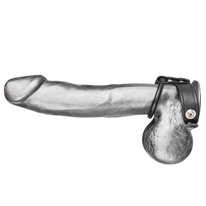 Это двойное эрекционное кольцо из искусственной кожи для утяжки пениса и мошонки, стимулирующее эрекцию, добавляющее толщину и способствующее увеличению размера полового члена. Диаметр хомута на клепках, утягивающего пенис и мошонку, может варьироваться от 4 см. до 5 см. Диаметр тонкого резинового кольца на пенис - 4 см., при этом оно хорошо тянется. Упаковка: Блистер.