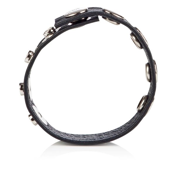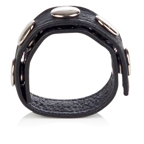 Утяжка для пениса из кожи с регулирующимся размером с помощью блестящих кнопок. Максимальный диаметр - 6,5 см., минимальный - 4 см.