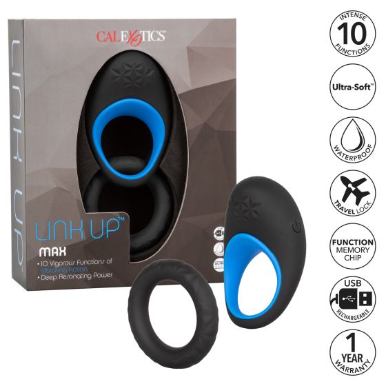 Набор эрекционных колец Link Up Max – двойное стимулирующее кольцо доставляет интенсивное удовольствие с 10 мощными функциями вибрации, дополнительным поддерживающим кольцом Ultra-Soft и дразнящей ребристой текстурой. Оно изготовлено из гладкого, шелковистого на ощупь, безопасного для здоровья медицинского силикона. Кольцо препятствует оттоку крови для поддержания эрекции и замедляя процесс эякуляции. Оно имеет уникальную ребристую форму обеспечивающую дополнительную стимуляцию клитора или яичек во время полового акта. Бархатистая поверхность обеспечит максимально нежные тактильные ощущения. Управление осуществляется с помощью всего одной кнопки в головке. Для переключения скорости достаточно всего одного нажатия. Кольцо заряжается через специальный аккумуляторный USB кабель и может быть подключено практически в любом месте. Просто подсоедините идущий в комплекте шнур к изделию и совместимому порту компьютера или USB-адаптера (приобретается отдельно). Полная зарядка занимает 2,5 часа, ее достаточно для беспрерывной работы до 1,5 часа высокоинтенсивной вибрации. Внутренний диаметр колец - 3,75 см.