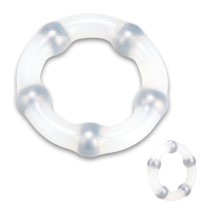 Белое полупрозрачное кольцо на пенис из упругого материала, в который вживлены 5 металлических шариков. Именно такое кольцо обеспечивает пролонгирующий эффект и одновременно стимуляцию обоих партнеров.