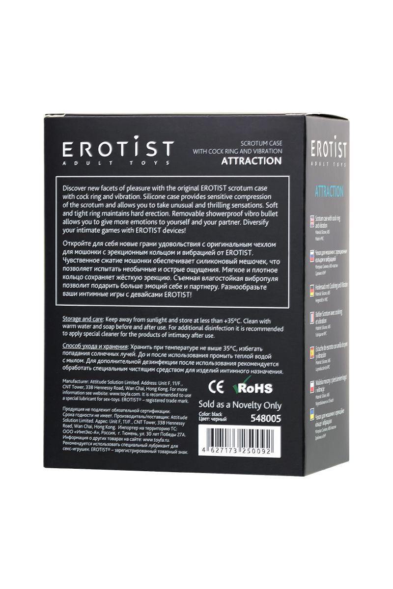 Откройте для себя новые грани удовольствия с оригинальным чехлом для мошонки с эрекционным кольцом и вибрацией от EROTIST. Чувственное сжатие мошонки обеспечивает силиконовый мешочек, что позволяет испытать необычные и острые ощущения. Мягкое и плотное кольцо сохраняет жёсткую эрекцию. Съемная влагостойкая вибропуля позволит подарить больше эмоций себе и партнеру. Разнообразьте ваши интимные игры с девайсами EROTIST! Диаметр кольца - 2,6 см.