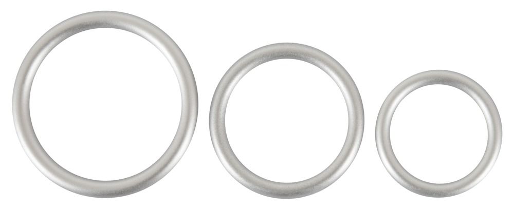 Три разных размера эрекционных кольца в комплекте. В опасном металлическом блеске - комфорт и безопасность силикона. Очень гибкие, так что их можно легко разместить над пенисом и яичками, чтобы создать твердую эрекцию, которая длится долгое время. Диаметр колец - 3,3, 4 и 5,1 см.