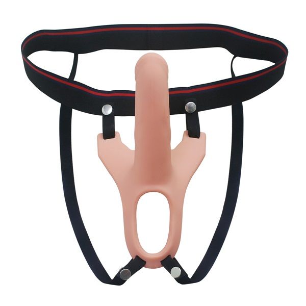 Страпон с насадкой из силикона в виде члена. Насадка удобно крепится к телу при помощи лент, размер регулируется. Насадка изготовлена из силикона, имеет ярковыраженную головку и отверстие для члена. Диаметр отверстия - 3 см.