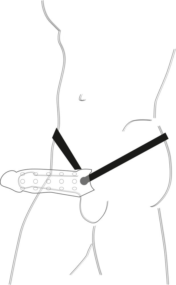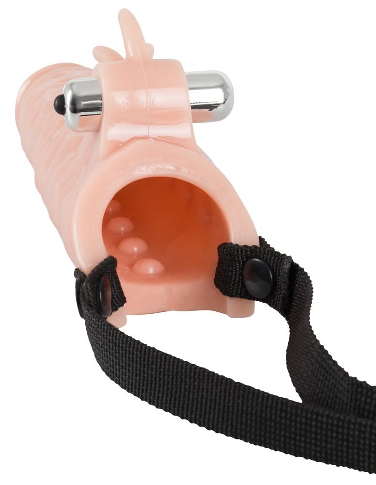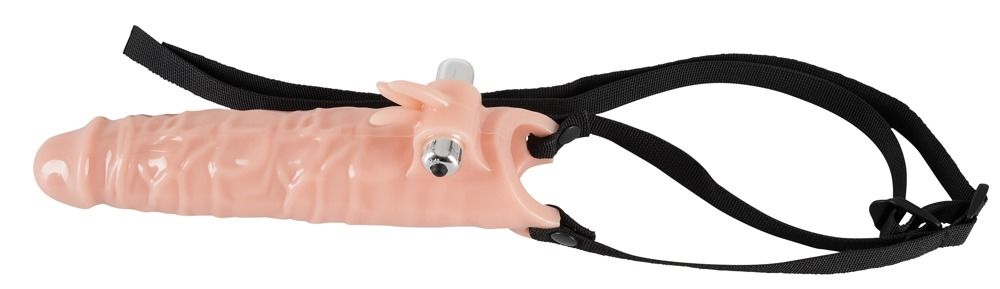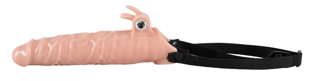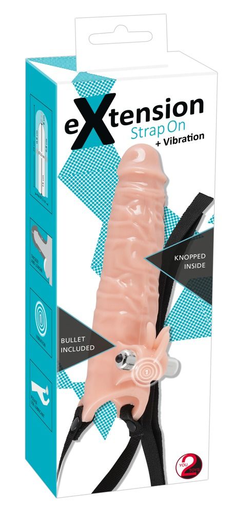 Вибрострапон Exstention телесного цвета на ремешках. Обеспечивает прирост длины и диаметра полового члена. Фиксируется на бёдрах ремнями. Вибростимулятор в основании гарантирует стимуляцию клитора партнёрши. Минимальный внешний диаметр - 3,8 см. Внутренний диаметр - 3,6 см. Рабочая длина - 18 см. Длина внутренней полости - 15 см.