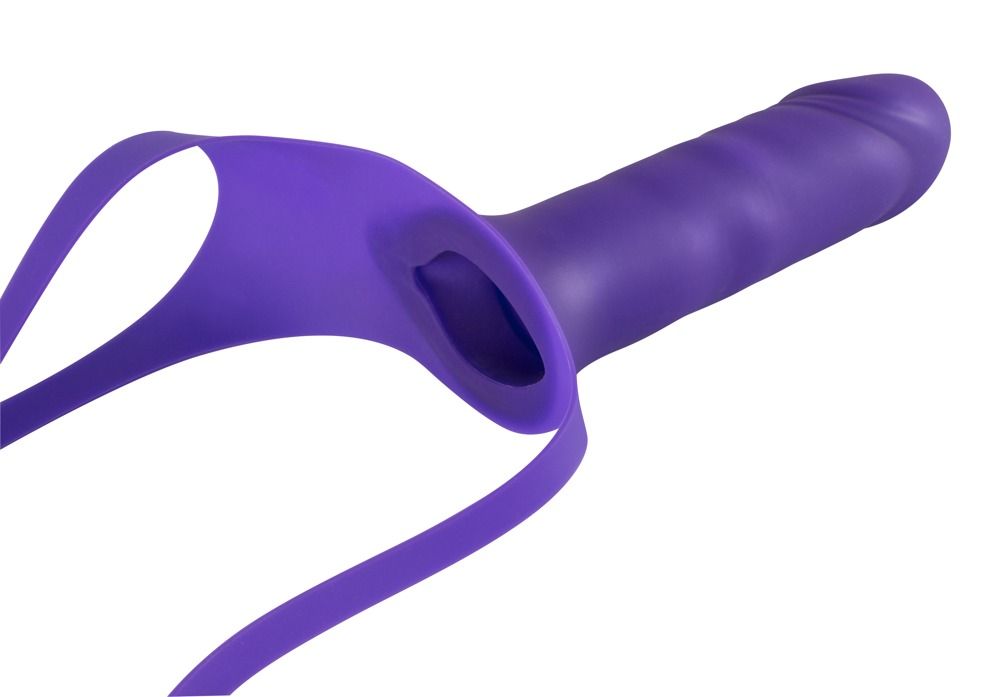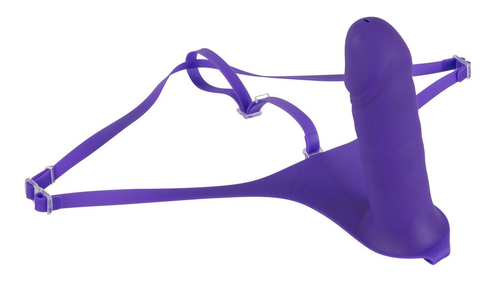 Фиолетовые трусики с фаллосом StrapOn for Lovers. Фаллос вставляется в вагину и фиксируется на бёдрах дамы ремешками. Мужчина проникает в полость членом - отверстие для выхода спермы имеется. Внутренний диаметр - 3,7 см.