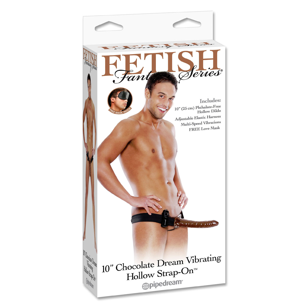 Фаллопротез коричневого цвета, на ремешке-резинке системы Strap-On с вибрацией. Скорость вибрации управляется с помощью выносного пульта. В комплекте маска на глаза черного цвета.