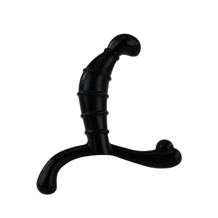 Мужской массажер для стимуляции простаты. Изогнутая анальная пробка с расширенной головкой для стимулирования предстательной железы изнутри, ребристая поверхность основания для массажа стенок ануса. Тонкий отросток анатомически загнутый с шариком на кончике для массажа предстательной железы снаружи, специальный удобный держатель. Гладкий пластик. Рабочая длина - 14 см.