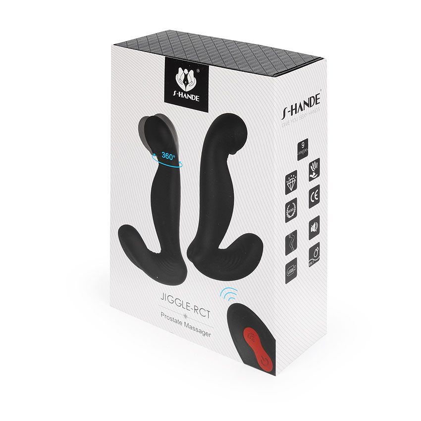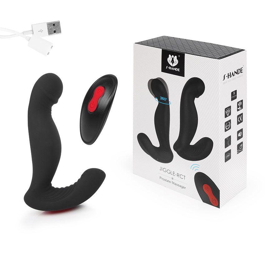 Черный вибростимулятор простаты JIGGLE-RCT. Имеет 9 режимов вибрации и вращающийся кончик. Управлять функционалом можно при помощи пульта ДУ.
