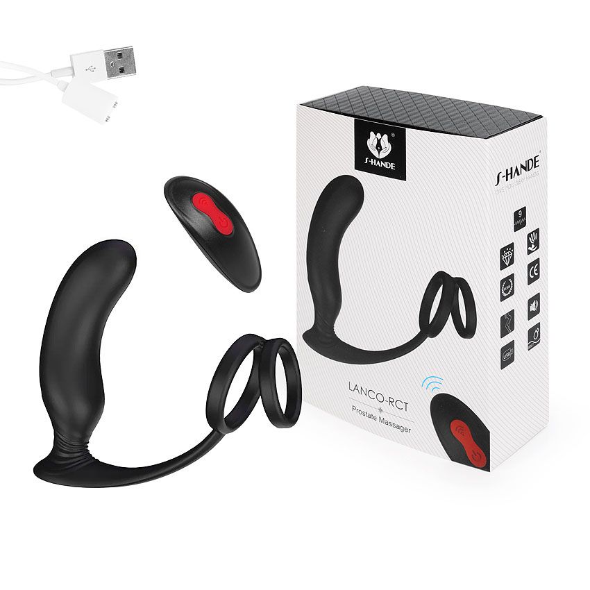 Чёрный вибромассажёр простаты с эрекционным кольцом и пультом ДУ S-HANDE LANCO-RCT SHD-S122-2