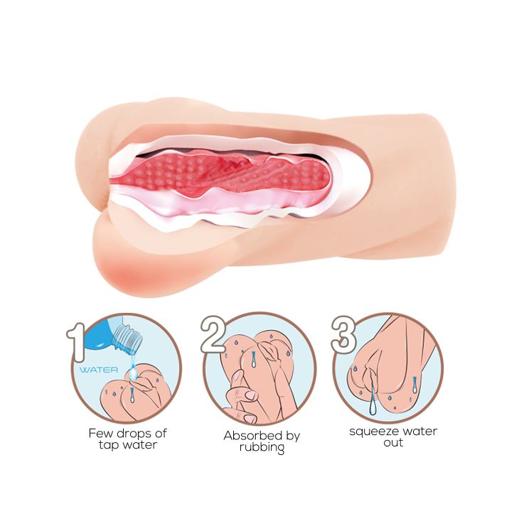 Мастурбатор с вагинальным отверстием изготовлен из особенного материала. Особенность заключается в том, что при добавлении нескольких капель воды в тоннель мастурбатора, материал принимает консистенцию скользящей, увлажняющей смазки. Имеет натуральный телесный цвет и очень правдоподобные внутренние складки, которые приносят ощущение полноценного сексуального контакта за счет плотного облегания ствола пениса.