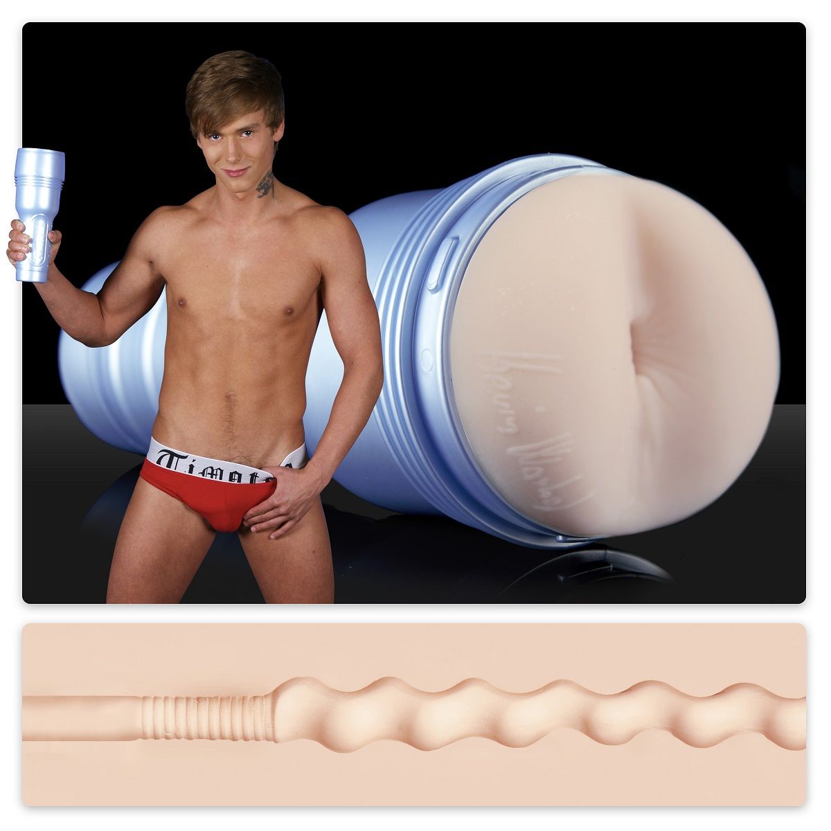 Американский актер и модель Кевин Вархол из команды Flashjack совместно с FleshLight выпустил линейку игрушек для взрослых. Слепок ануса известного ХХХ-актера сделан из запатентованного материала SuperSkin, имитирующего на ощупь кожу человека. Мастурбатор-анус помещен в синюю пластиковую колбу, регулируя открытие которой, можно изменять степень воздействия на Ваш фаллос при мастурбации. Тоннель внутри мастурбатора имеет вид сначала узкого гладкого канала, затем его покрытие становится ребристым, и далее начинается волнообразный канал. Вы можете перед использованием нагреть вставку-мастурбатор в теплой воде для максимально комфортных ощущений, производитель рекомендует использовать лубрикант.