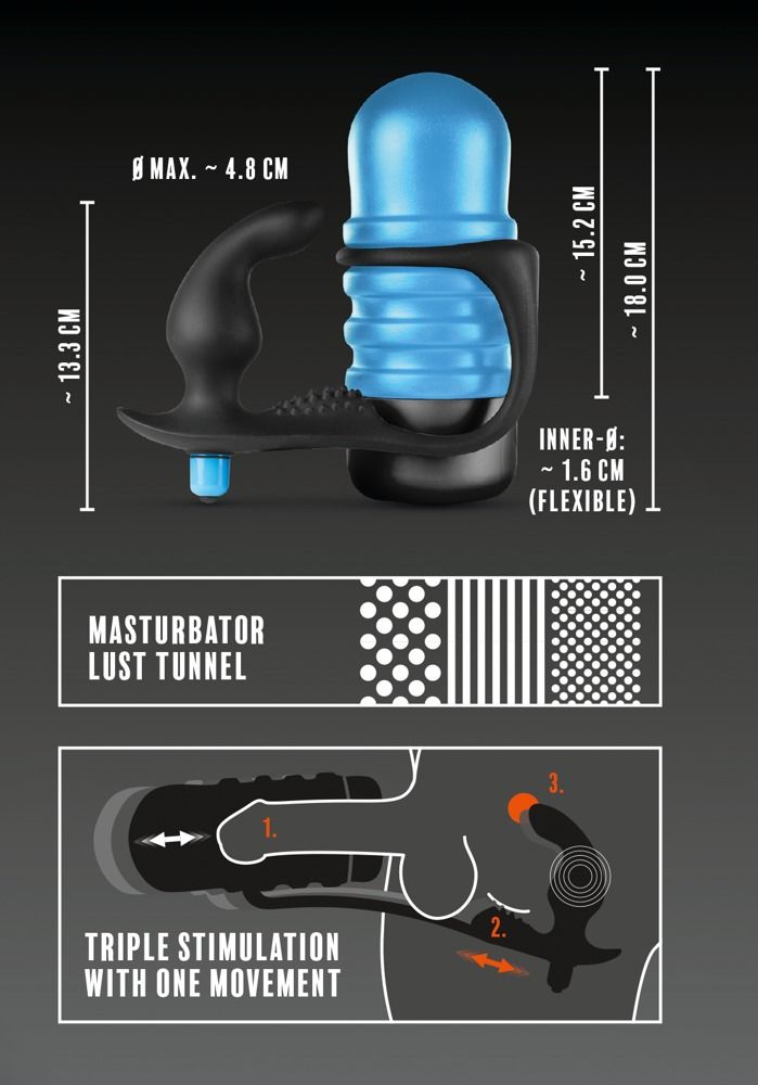 The Surge - это уникальная секс-игрушка, которая сочетает в себе мастурбатор и анальную втулку с вибрацией для одновременной стимуляции полового члена, промежности и предстательной железы. Этот набор игрушек 3 в 1 можно использовать как вместе, так и по отдельности. Откройте для себя новые уровни оргазма! Многоразовый мастурбатор связан с вибрирующей втулкой мягким силиконовым мостиком, на поверхности которого расположена рельефная вставка, За счет этого, при мастурбации происходит стимуляция не только мужской точки G но и промежности. Мастурбатор выполнен из мягкого и эластичного материала, с упругим входом и рельефным внутренним каналом для интенсивной стимуляции пениса. Рукав полностью вынимается из чехла, что делает его удобным в очистке. Анальный вибратор с мягкой, бархатистой поверхностью имеет специальную, анатомическую форму с загнутым кончиком для стимуляции мужской точки G и интенсивного массажа простаты. Для усиления стимуляции Вы можете включить вибрацию. Съемная вибропуля в основании игрушки включает в себя 10 режимов вибрации, которые легко переключаются с помощью одной кнопки. Длина мастурбатора - 18 см. Длина пробки - 13,3 см., диаметр - 4,8 см.