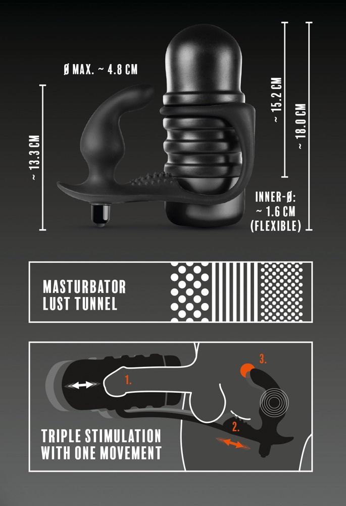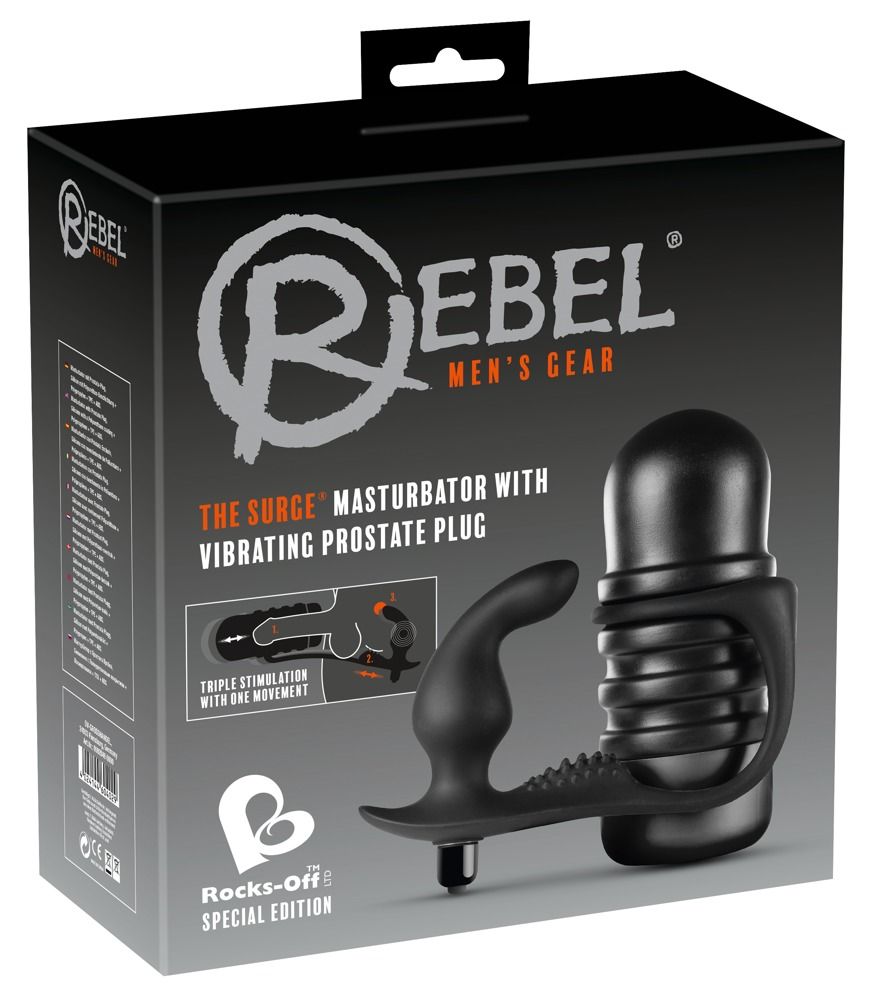 The Surge - это уникальная секс-игрушка, которая сочетает в себе мастурбатор и анальную втулку с вибрацией для одновременной стимуляции полового члена, промежности и предстательной железы. Этот набор игрушек 3 в 1 можно использовать как вместе, так и по отдельности. Откройте для себя новые уровни оргазма! Многоразовый мастурбатор связан с вибрирующей втулкой мягким силиконовым мостиком, на поверхности которого расположена рельефная вставка, За счет этого, при мастурбации происходит стимуляция не только мужской точки G но и промежности. Мастурбатор выполнен из мягкого и эластичного материала, с упругим входом и рельефным внутренним каналом для интенсивной стимуляции пениса. Рукав полностью вынимается из чехла, что делает его удобным в очистке. Анальный вибратор с мягкой, бархатистой поверхностью имеет специальную, анатомическую форму с загнутым кончиком для стимуляции мужской точки G и интенсивного массажа простаты. Для усиления стимуляции Вы можете включить вибрацию. Съемная вибропуля в основании игрушки включает в себя 10 режимов вибрации, которые легко переключаются с помощью одной кнопки. Длина мастурбатора - 18 см. Длина пробки - 13,3 см., диаметр - 4,8 см.