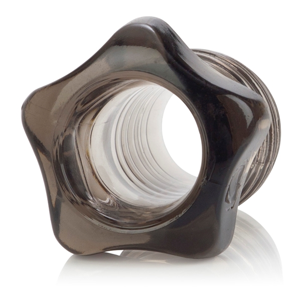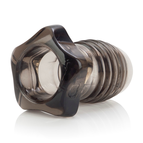 Насадка на пенис в виде болта с гайкой. Ребристая поверхность внутри и снаружи. Мягкий, легко растягивается до нужных размеров.
