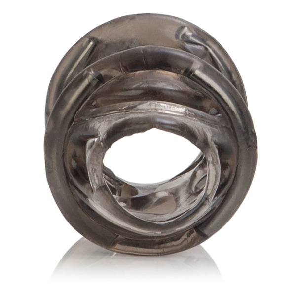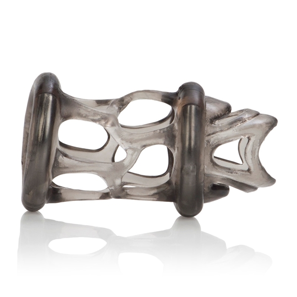 Насадка на пенис серого цвета со вставленными металлическими полукольцами в верхнем и нижнем основании для дополнительной стимуляции.