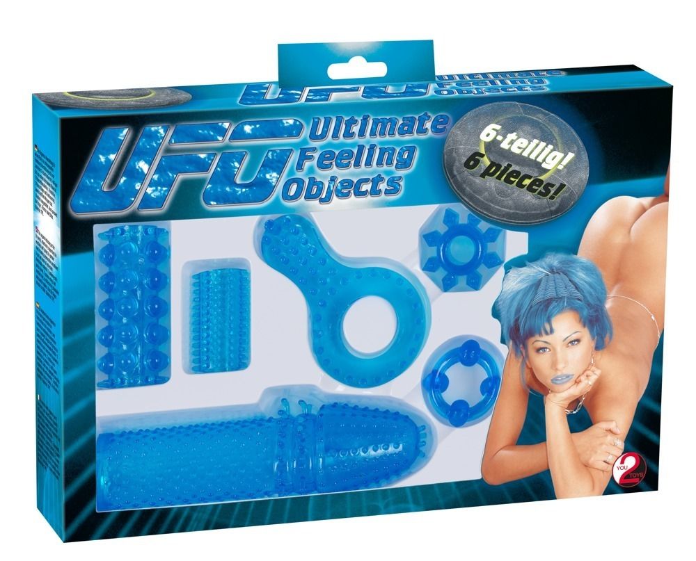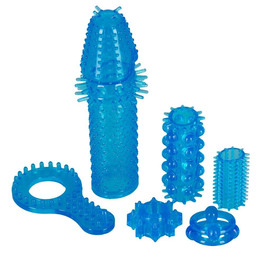 Набор из шести насадок, сделанных из очень гибкого силиконового материала. Одна насадка на мужской половой орган со стимулирующими пупырышками, две насадки с шариками и шипиками, одно кольцо со стимулятором точки G, две насадки-кольца с выпуклостями.