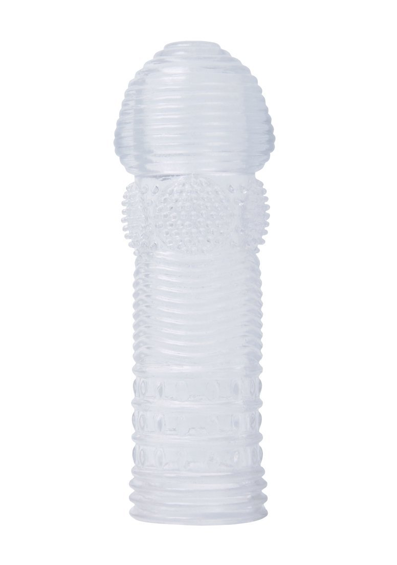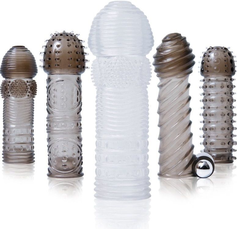 Набор из 5 рельефных насадок на пенис одинаковой длины. Четыре из них дымчатые: с щеточками на поверхности, со спиралями и вибропулей, с шипастой головкой и с шипами по всей длине. Пятая насадка прозрачная, с 4 видами рельефа поверхности. Батарейки в комплекте.