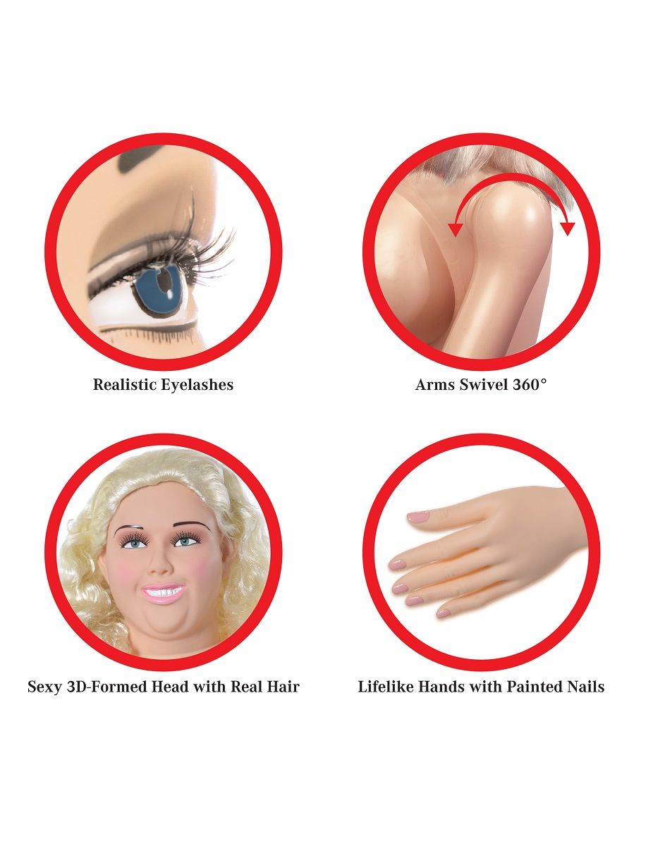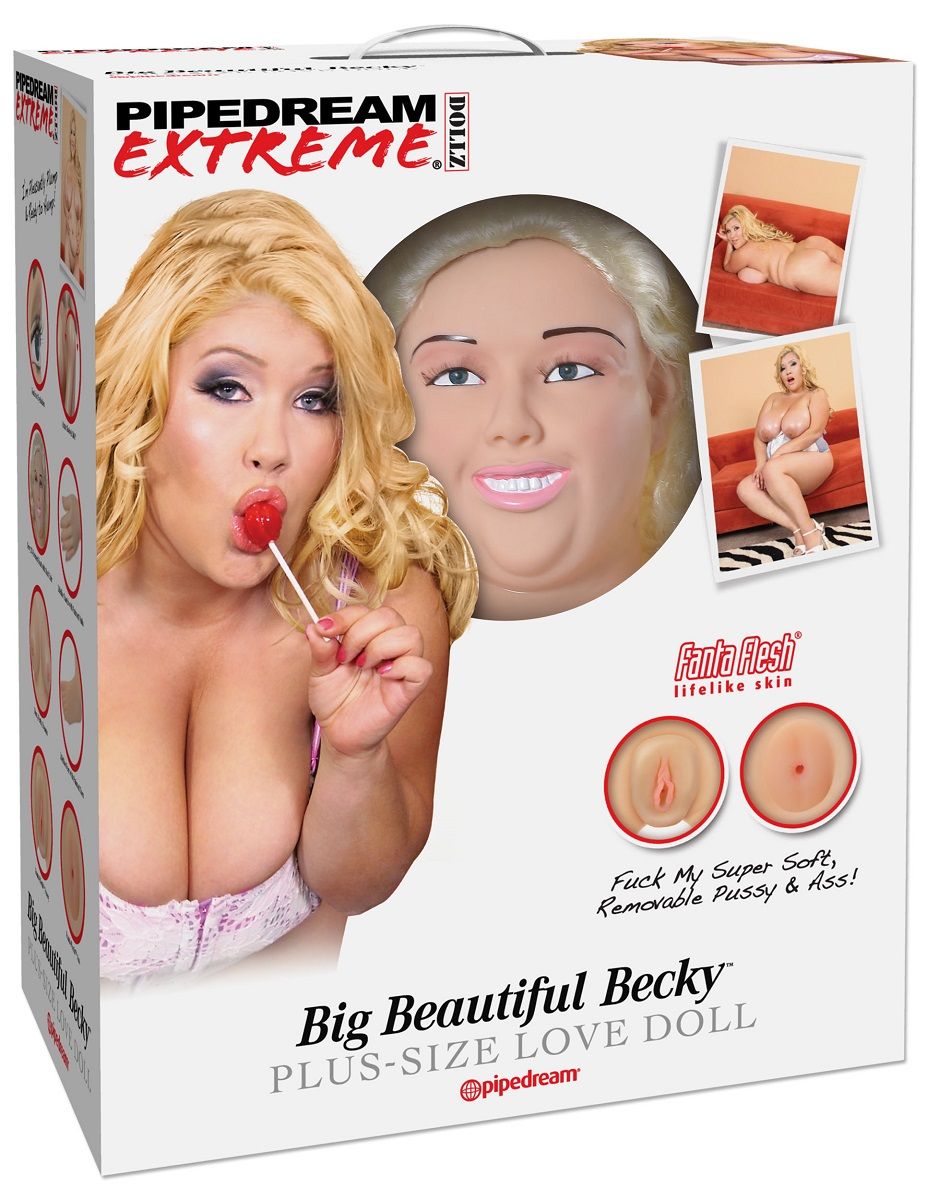 Кукла надувная Big Beautiful Becky – аппетитная, пышногрудая толстушка: зеленоглазая блондинка с румяными щёчками, пушистыми ресницами, нежно-розовыми губками, пухлыми пальчиками на руках и ногах – такая мягкая и приятная, эталон женственности и сексуальности.• Реалистичная вставка вагина и анус, может использоваться как, отдельный мастурбатор.• 3D модель лица, реалистичные волосы.• Реалистичные глаза с пушистыми ресницами.• Сексуально приоткрытый рот.• Реалистичные груди и соски.• Реалистичные кисти и ступни с аккуратным маникюром и педикюром.• Поворот рук на 360 градусов. В комплекте набор для ремонта и насос.