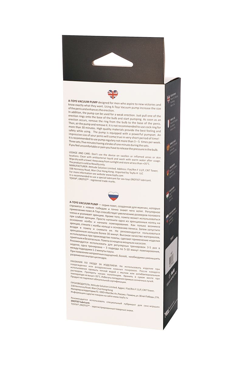 A-Toys Vacuum pump — серия помп, созданная для мужчин, которые стремятся к новым победам и точно знают чего хотя. Регулярное применение помп Atoys способствует увеличению размеров полового члена и усиливает эрекцию. Высокое качество материалов, используемых при производстве помпы, сделают применение изделия приятным и безопасным. Помпа оснащена мощным насосом, а также механизмом вибрации, которое крепится к помпе с помощью эластичного материала с кармашком для виброяичка и управляется выносным пультом. В комплекте: вакуумная помпа с вибропулей, 3 эрекционных кольца.