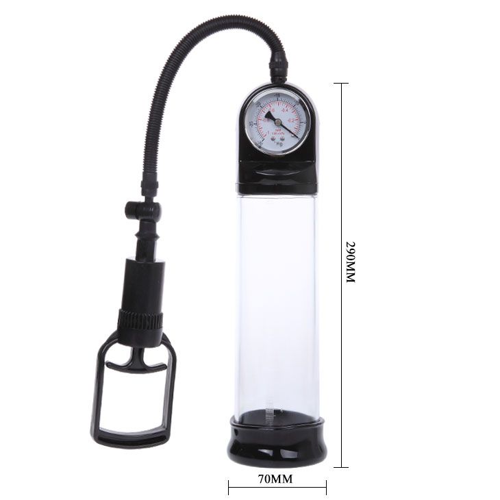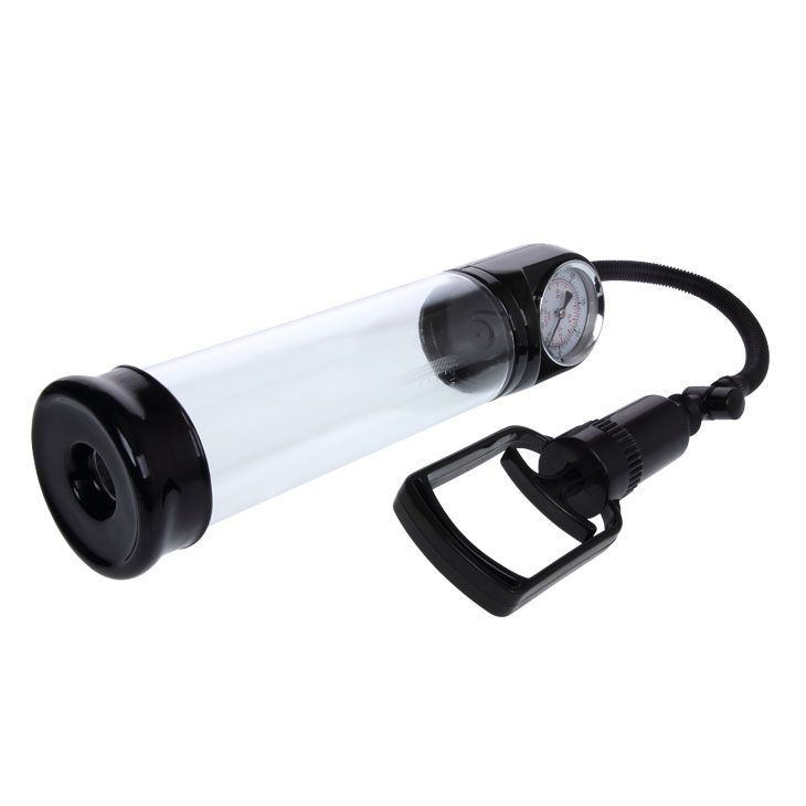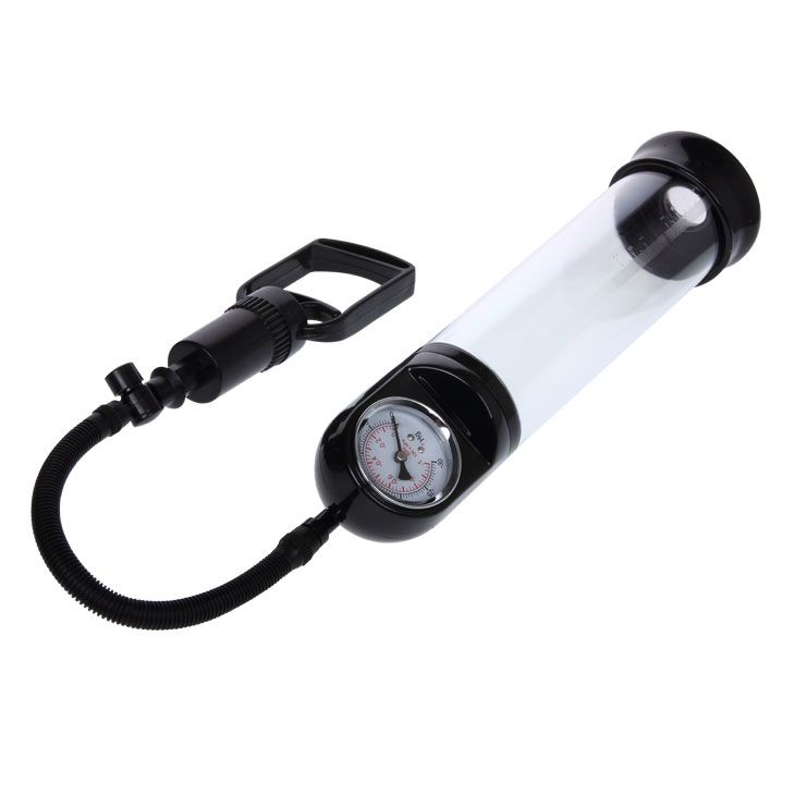 Вакуумная помпа для мужчин прозрачного цвета. Помпа снабжена удобным рычажком для создания вакуума и встроенным манометром для контроля степени разряжения воздуха. Эластичный уплотнитель помогает увеличить поверхность соприкосновение помпы с кожей.