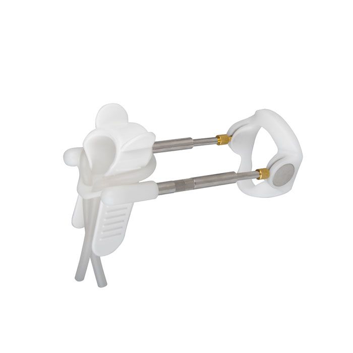 Действие экстендера основано на принципе вытяжения полового члена для увеличения его длины. Данный экстендер состоит из пластикового кольца, имеющего углубление для уретры. Диаметр основного кольца 4 см. Длина металлических стержней от кольца до пластикового основания для головки пениса 8 см в “сжатом” положении. Носить не более 40 минут за раз. Максимальная длина от основания до кольца 27 см.
