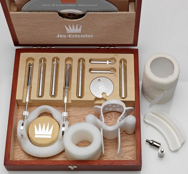 Jes-Extender Silver – прибор с серебряным покрытием для увеличения полового члена. При регулярном ношении по 6-10 часов в сутки экстендер позволяет удлинить пенис до 24,5 см! Благодаря растягивающему усилию в тканях полового члена усиливается рост новых клеток. Таким образом, предмет мужской гордости становится длиннее, плюс увеличивается его диаметр. Для начала использования Jes-Extender Silver следует установить стартовую длину штанг, пройти расслабленным членом в упорное кольцо, оттянуть крайнюю плоть, наложить смягчающую защитную прокладку и зафиксировать её ремешком. После необходимо отрегулировать натяжение (по насечкам 600, 900, 1200 и 1500 грамм) при помощи винтов. Важно: в первые 2 недели использования рекомендуется не превышать усилие в 600 грамм! Чтобы восстановить кровообращение в процессе ношения, экстендер следует ненадолго снимать каждые 1-1,5 часа. Клинические испытания показали – прибор безопасен и высокоэффективен при регулярном использовании. Упакован в футляр из красного дерева. Комплектация: удлиняющие стержни (4х5 см, 2х2,5 см), гибридная насадка Comfort (используется ремешок или жгут), фиксирующий ремешок, силиконовый жгут-фиксатор, смягчающая прокладка, упорное кольцо с пружинным механизмом, самофиксирующийся бинт Peha-Haft и две смягчающие прокладки. К товару прилагается DVD-инструкция, инструкция на русском языке, набор ключей.