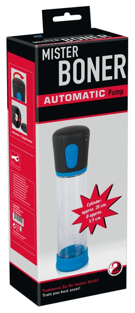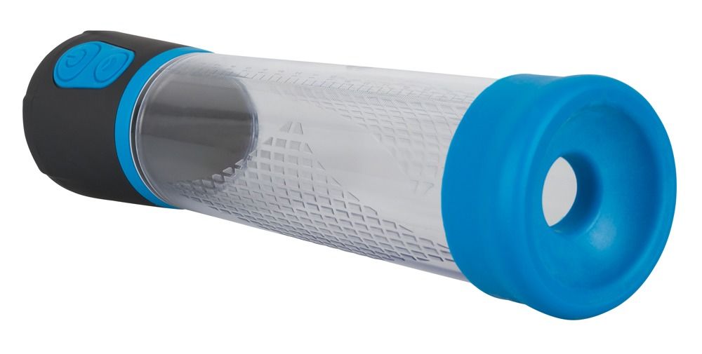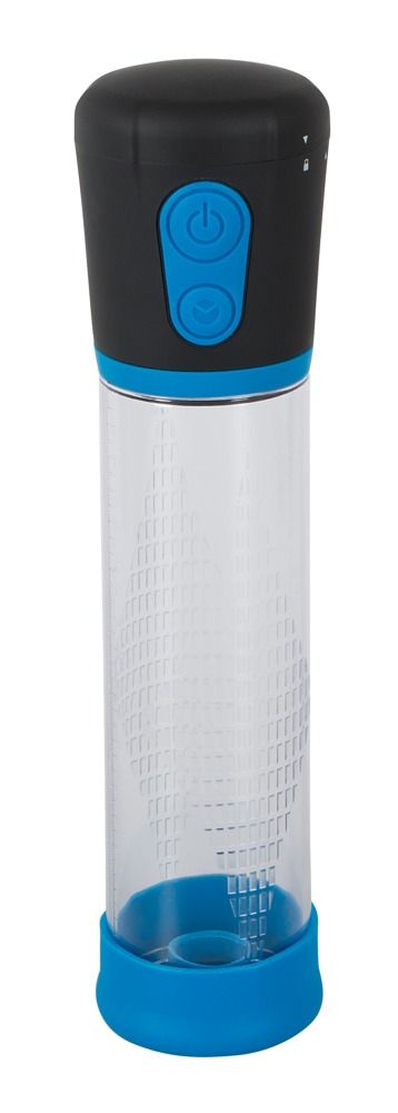 Автоматическая помпа для пениса Mister Boner. С уплотнительной манжетой голубого цвета и шкалой на колбе. Глубина колбы - 20 см.