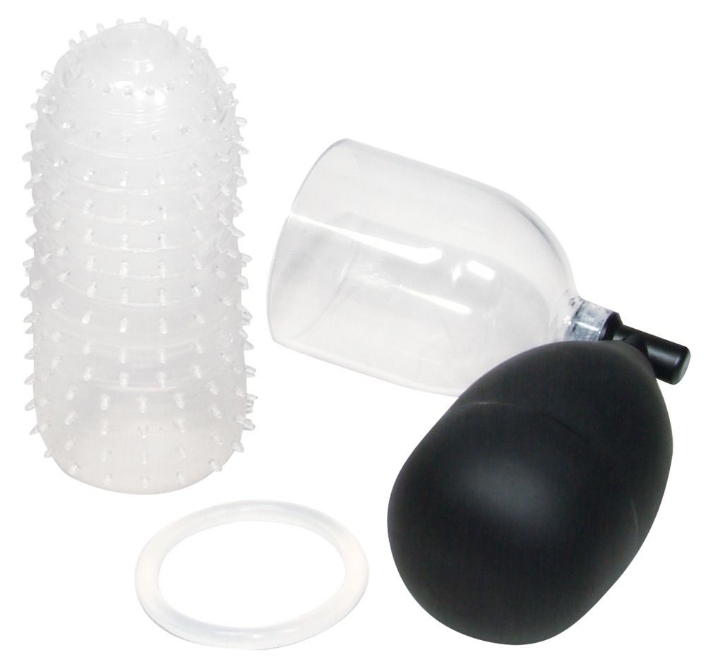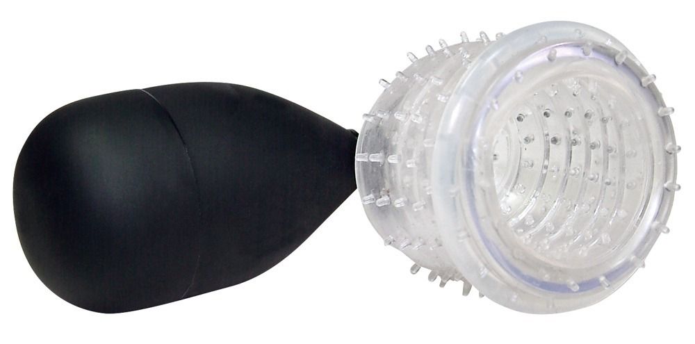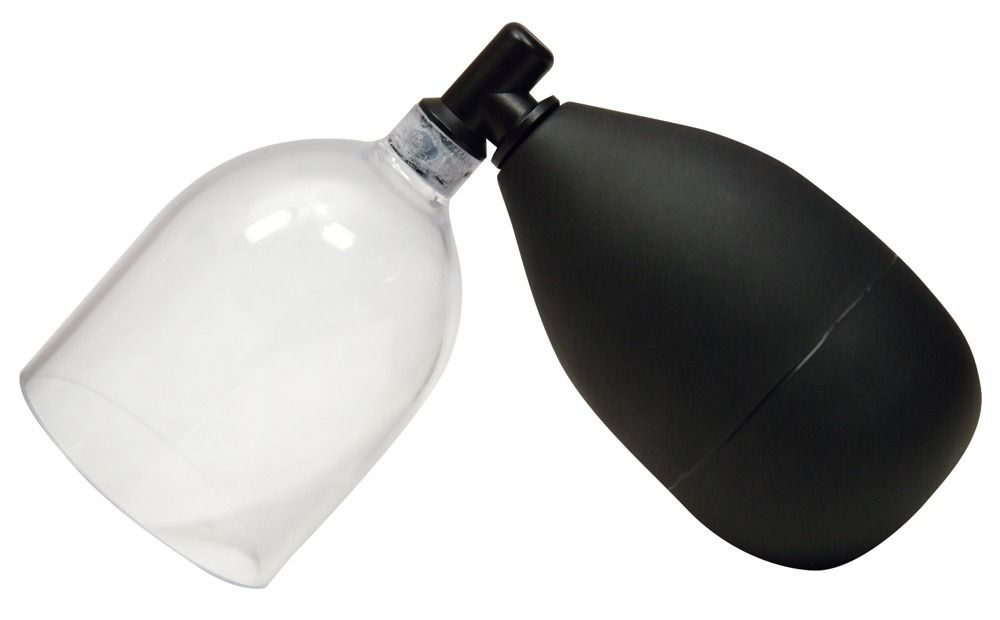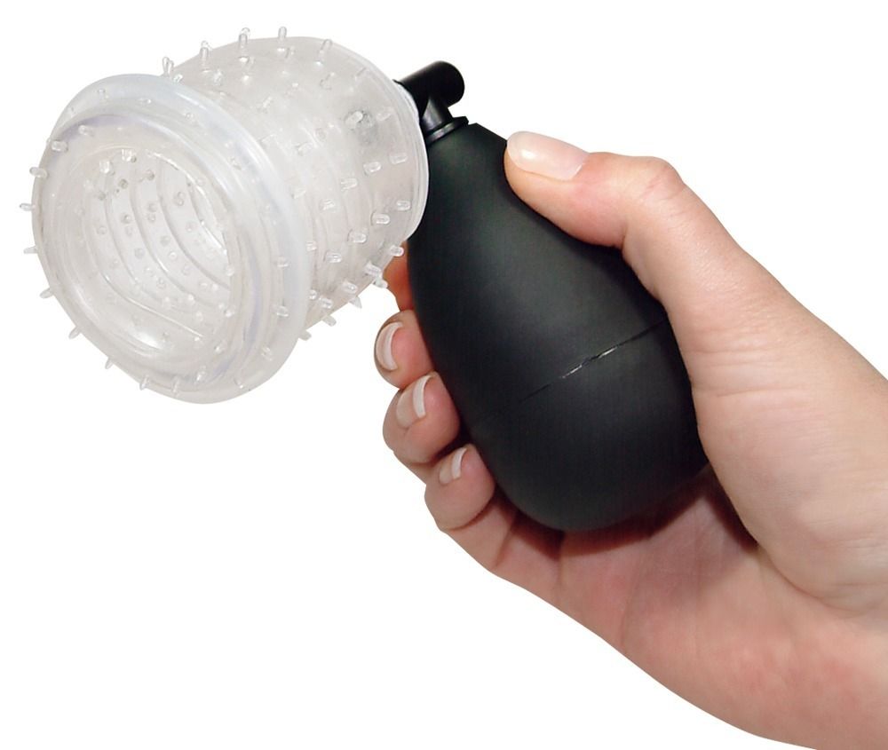 Вакуумная помпа для головки One-hand BlowJob. Состоит из колбы с грушей, нежной вставки с шипами и эрекционного кольца. Длина колбы - 6,5 см., диаметр - 5,4 см. Диаметр кольца - 4,5 см. Длина манжеты - 12 см., диаметр - 4,5 см.
