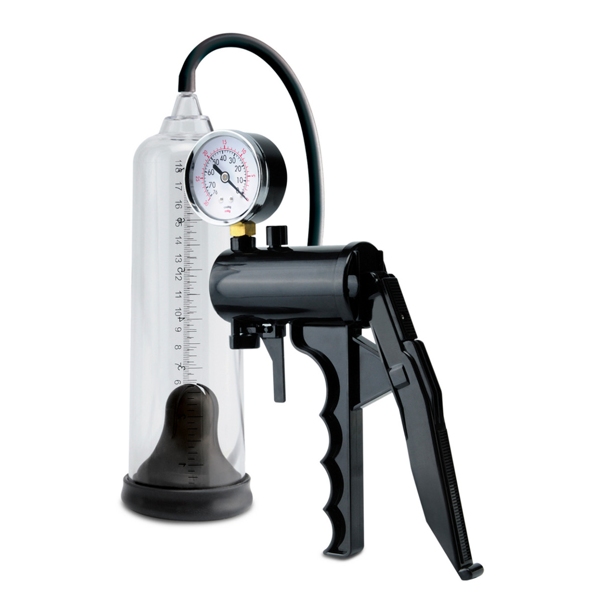 Вакуумная помпа выполненная из прозрачного пластика с уплотненной манжетой черного цвета. Воздух откачивается при помощи механизма с монометром. Отверстие для подачи воздуха располагается на самой колбе.