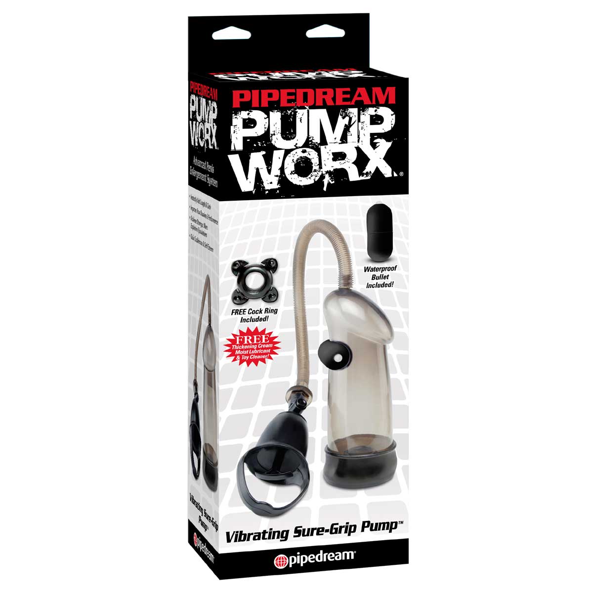 Помпа мужская SURE GRIP для создания эрекции путем откачки воздуха с помощью поршня. Новинка коллекции PUMP WORX: колба помпы оригинальной формы. Качественный уплотнитель из мягкой резины плотно обхватывает пенис во время процедуры. Помпа оснащена съемным мини-вибратором. Включите мощную вибрирующую мини-пулю и наслаждайтесь дополнительным возбуждением. Вибрация плавно переключается. Для вибро-пули требуется три батарейки типа таблетка , они входят в комплект. Вакуумная помпа служит удобным инструментом для создания очень твердой и устойчивой эрекции и подходит для продвинутых пользователей. С каждым нажатием на педаль поршня, пенис становится все больше и толще. Прозрачная колба позволит видеть процесс увеличения пениса. В подарок от производителя - эрекционное кольцо, которое поможет продлить эрекцию после применения помпы. Кольцо сначала нужно одеть на край помпы с уплотнителем, а после создания нужной степени эрекции сдвинуть с помпы на основание пениса. Кроме того, использование эрекционного кольца служит механическим пролонгатором: сдавливание кольцом продлит эрекцию и удовольствие, но отложит эякуляцию. Если использовать вакуумную помпу в качестве мастурбатора, то после оргазма, отсоединить цилиндр от шланга и промыть теплой водой с мылом. Уход за вакуумной помпой очень прост.