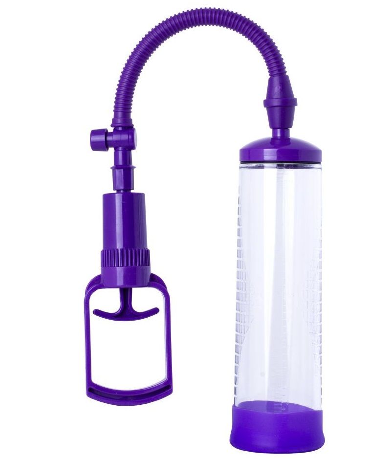 Фиолетовая вакуумная помпа с прозрачной колбой. С мягким уплотнителем на входе. Набор из 3 эрекционных колец разного диаметра в качестве бонуса.