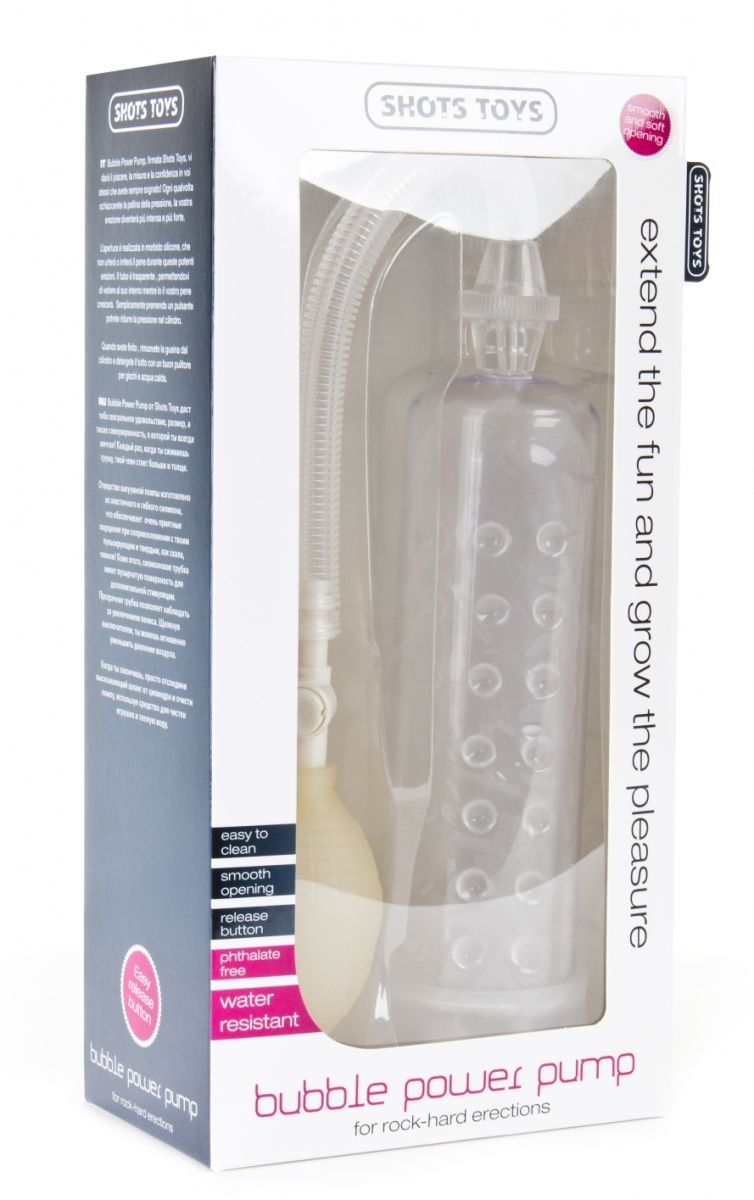 Bubble Power Pump от Shots Toys даст тебе сексуальное удовольствие, размер, а также самоуверенность, о которой ты всегда мечтал! Каждый раз, когда ты сжимаешь грушу, твой член станет больше и толще. Отверстие вакуумной помпы изготовлено из эластичного и гибкого силикона, что обеспечивает очень приятные ощущения при соприкосновении с твоим пульсирующим и твердым, как скала, членом! Прозрачная колба позволяет наблюдать за увеличением пениса.