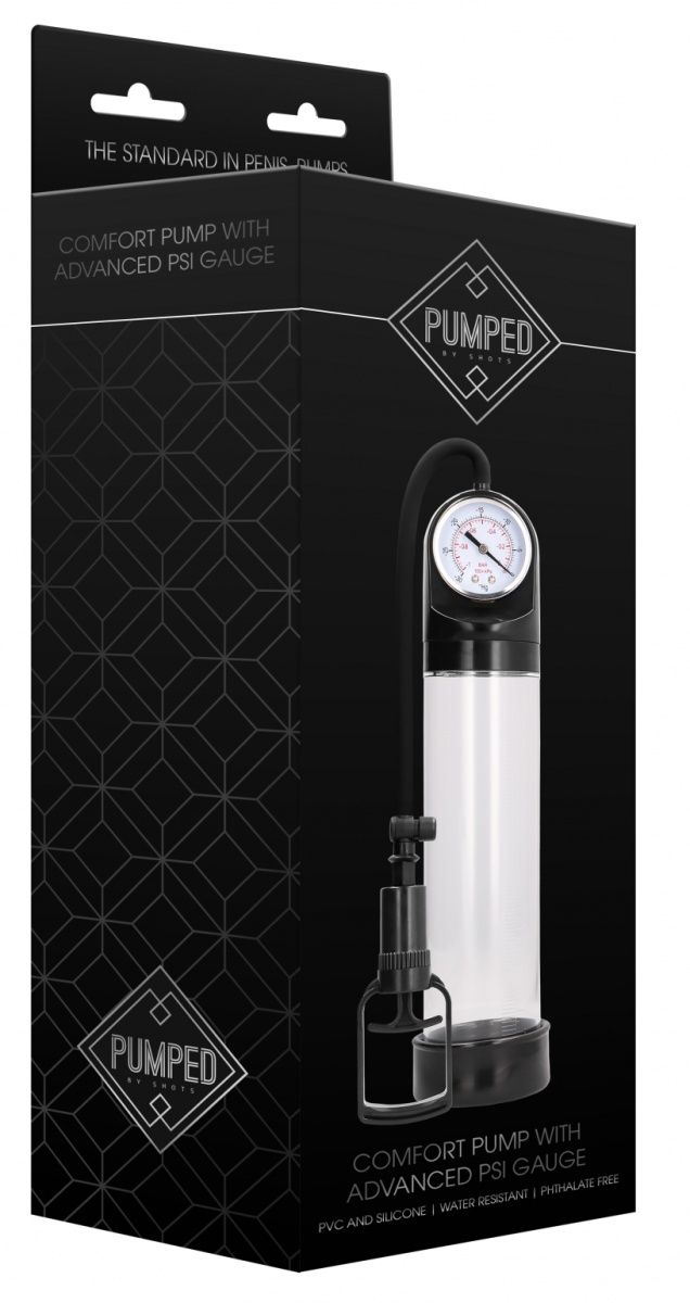 Comfort Pump With Advanced PSI Gaug – вакуумная помпа, состоящая из колбы с манометром для контроля давления, уплотнителя и ручного насоса в виде поршня. Такого формата рукоятка дает больше, чем груша. Она требует меньшего количества нажатий и быстрее создает более эффективное вакуумное давление. С поршневым насосом легче сохранять контроль над давлением в помпе. Помпа оснащена кнопкой быстрого выпуска воздуха. Для получения максимального эффекта использование помпы должно быть регулярным. В комплекте: помпа, эрекционное кольцо. Внутренний диаметр - 5 см. Рабочая длина - 23 см.