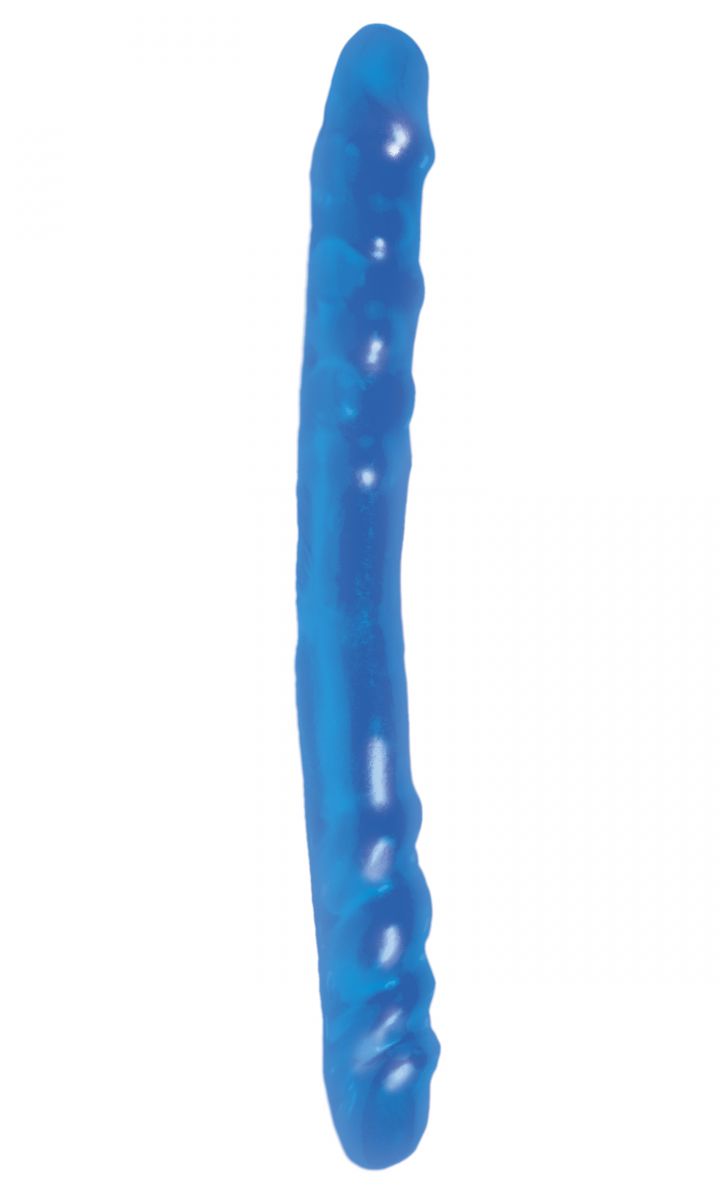 Полупрозрачный двойной фаллоимитатор синего цвета. Рельефный, невероятно гибкий и приятный на ощупь.
