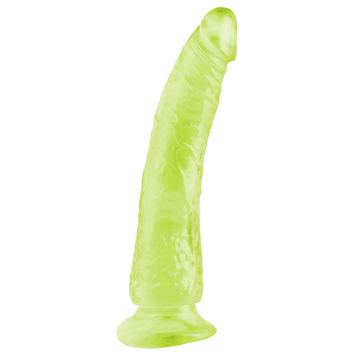Небольшой полупрозрачный фаллоимитатор желтого цвета. Форма, суженная к области головки полового члена, позволяет его использовать так же как анальный стимулятор. Материал – пвх. Имеется присоска для более комфортного использования. Гибкий и упругий, без швов. Светится в темноте.