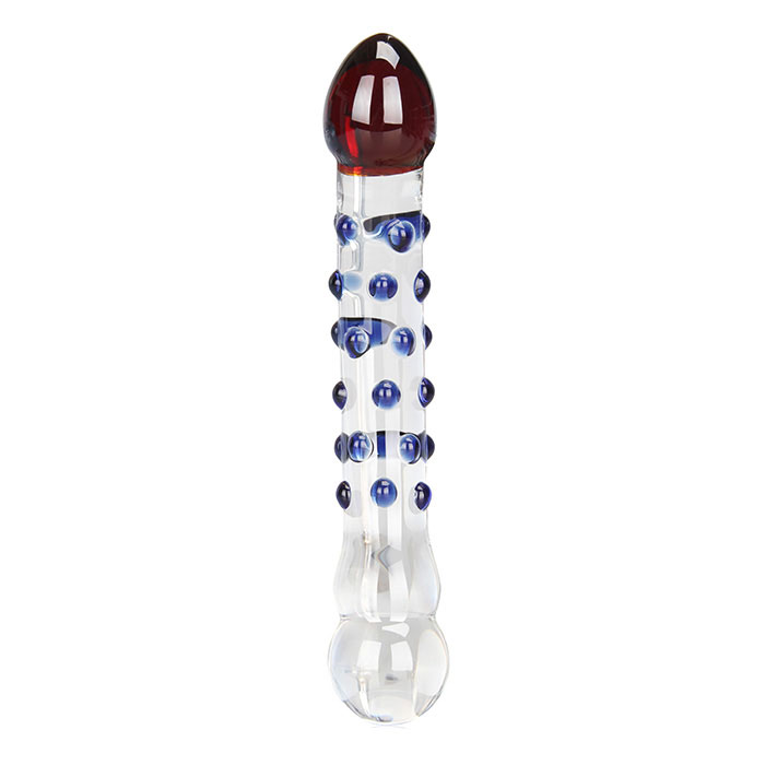 Двусторонний фаллоимитатор с двумя головками различной формы и массажными точками на стволе. Фаллоимитатор ручной работы из прозрачного закаленного стекла, которое является абсолютно гипоаллергенным и безопасным. Массажные точки выполнены синим цветом. Головка, имитирующая половой член, выделена янтарным цветом. Диаметр ствола - 2,5 см.