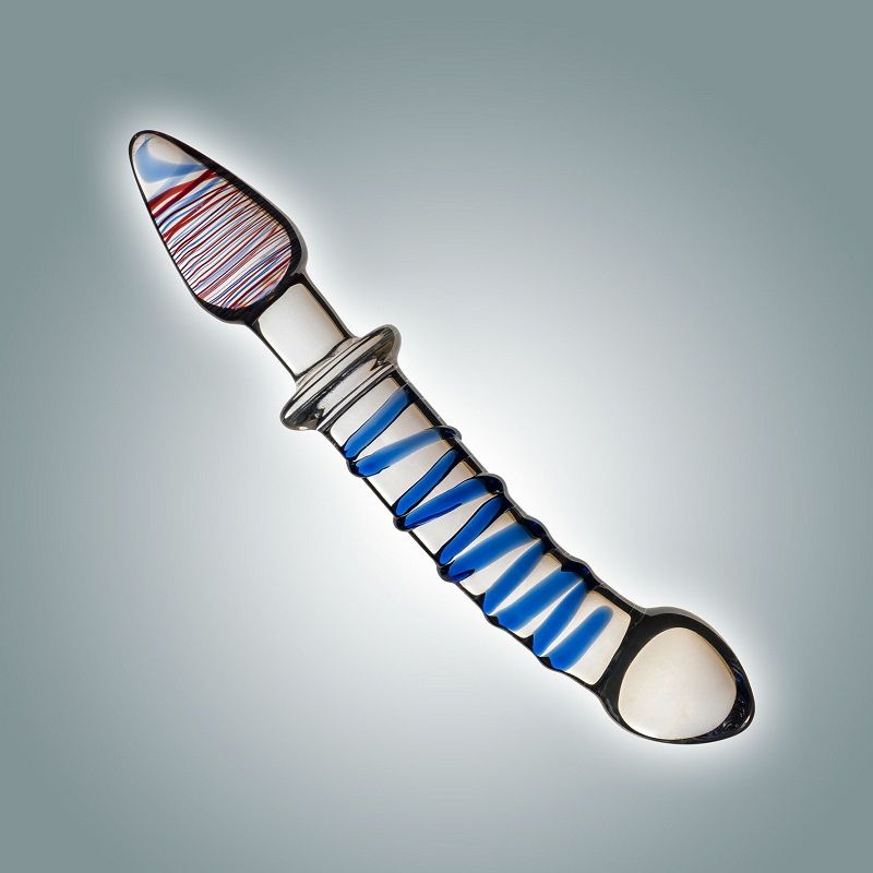 Двухголовый стеклянный стимулятор. Двухголовый стимулятор из стекла ручной работы, очень эргономичный. Игрушка имеет ребристую поверхность, что обеспечивает дополнительную стимуляцию и приятное скольжение в самые потайные места! Головки имеют увеличенный диаметр разной формы, что позволит получить больше ощущений во время вагинального массажа. Стекло высококачественное и полностью безопасное, гипоаллергенное. Рабочая длина вагинальной части - 12 см., диаметр - 2,9 см. Рабочая длина анальной части - 8 см., диаметр - 3,3 см.
