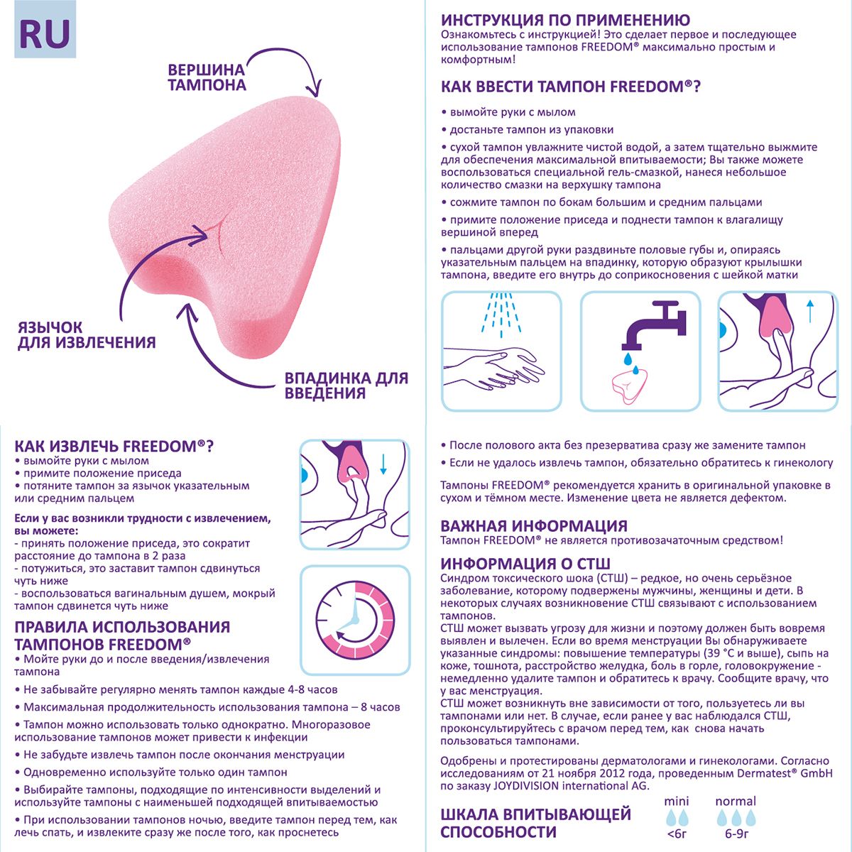FREEDOM® - тампоны нового поколения для современных женщин! • удобная форма в виде сердечка • специальный воздушный материал • легкость введения и извлечения • легко адаптируются под форму тела • не ощущаются внутри • одобрены гинекологами и протестированы дерматологами • подходят для средних и обильных выделений • произведены в Германии Тампоны FREEDOM® обеспечивают не только надежную защиту от выделений в критические дни, но и дают возможность не отказываться от своих обычных увлечений и планов! Заниматься любовью, спортом, плавать в бассейне, танцевать, встречаться с друзьями в СПА или отдыхать на пляже – с FREEDOM® все это возможно даже в критические дни! Подробная инструкция в каждой упаковке!