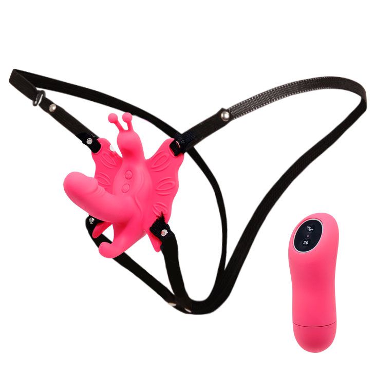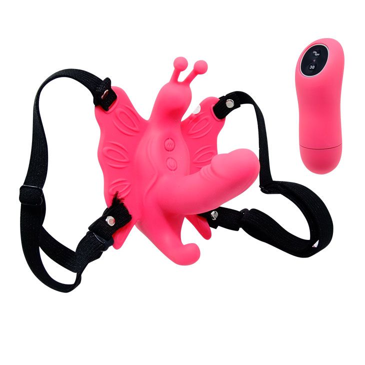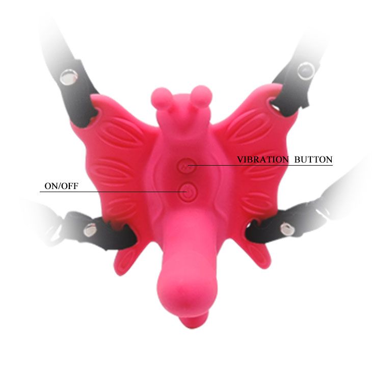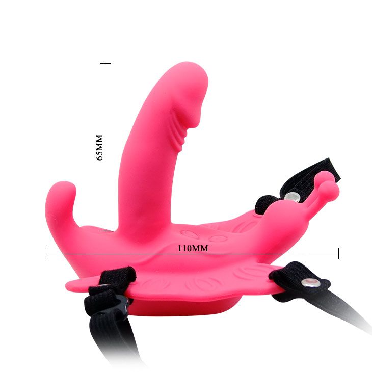 Стимулятор клитора в виде забавной бабочки с минифаллосом. Бабочка надежно крепится к телу при помощи ремешков. Длина фаллоимитатора - 6,5 см.