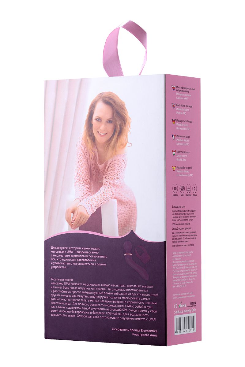 Для девушек, которым нужен идеал, создан UMA — вибромассажер с множеством вариантов использования. Все, что нужно для расслабления и удовольствия, совместили в одном устройстве. Терапевтический массажер UMA поможет массировать любую часть тела, расслабит мышцы и снимет боль после нагрузки или травмы. Ты сможешь восстановиться и расслабиться: просто выбери нужный режим вибрации из десяти вариантов! Круглая головка и вытянутая загнутая ручка позволят массировать самые разные участки твоего тела, а мягкая насадка прекрасно справится с нежным массажем лица. Для полного релакса ты можешь взять UMA с собой в душ или в ванну с душистой пеной и устроить настоящий SPA-салон прямо у себя дома! И все это без проводов и батареек. USB-кабель дает возможность зарядить его везде. Открой для себя потрясающие ощущения вместе с UMA!