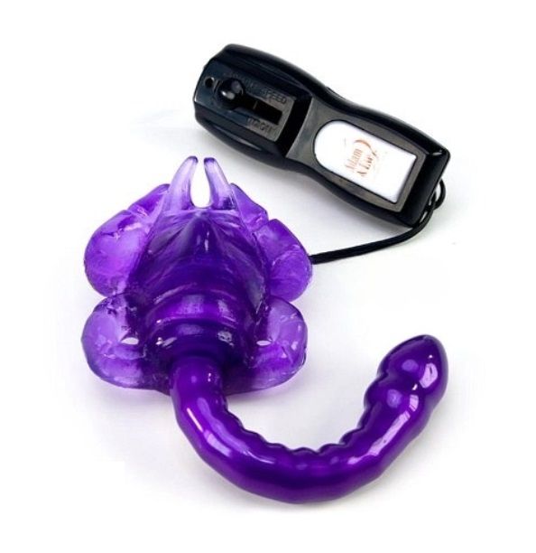 Клиторальный вибростимулятор-скорпион с изгибающимся анальным фаллоимитатором. Этой модели нет аналогов - усики стимулируют клитор, холмик - вход во влагалище, а тонкий вибрирующий фаллоимитатор - лучшее, что можно себе представить для анального удовольствия! Пульт управления вибрацией выносной. Также в комплект входит эрекционное кольцо со стимулятором клитора, куда вставляется маленький микро-вибратор, и батарейки к нему.