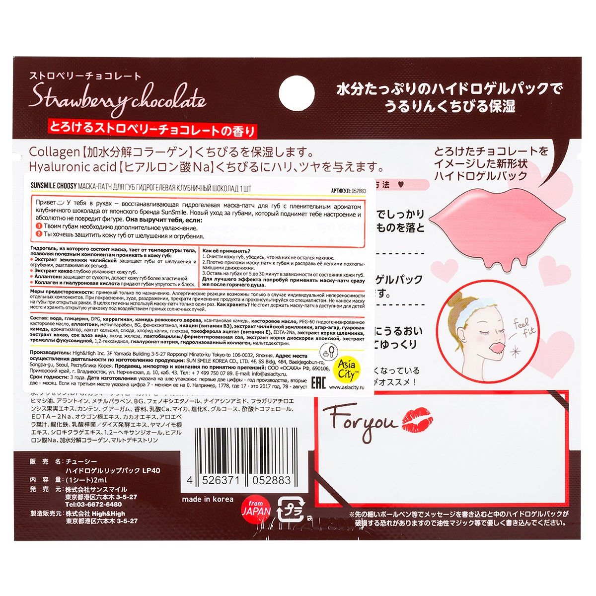Восстанавливающая гидрогелевая маска-патч для губ с пленительным ароматом клубничного шоколада от японского бренда SunSmile. Новый уход за губами, который поднимет тебе настроение и абсолютно не повредит фигуре. Подходит если необходимо дополнительное увлажнение или ты хочешь защитить кожу губ от шелушения и огрубения. Гидрогель, из которого состоит маска, тает от температуры тела, позволяя полезным компонентам проникать в кожу губ: защищает губы от шелушения и огрубения, разглаживая их рельеф, увлажняет кожу губ, делает кожу губ более эластичной. Коллаген и гиалуроновая кислота придают губам упругость и блеск.