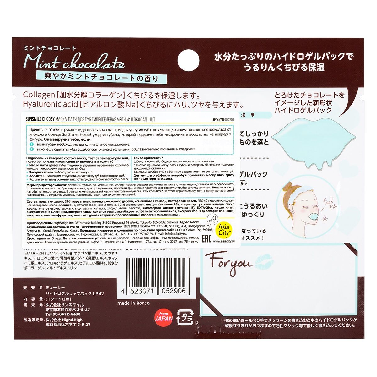 Восстанавливающая гидрогелевая маска-патч для губ с ароматом освежающего мятного шоколада от японского бренда SunSmile. Новый уход за губами, который поднимет тебе настроение и абсолютно не повредит фигуре. Подходит если необходимо дополнительное увлажнение или ты хочешь защитить кожу губ от шелушения и огрубения. Гидрогель, из которого состоит маска, тает от температуры тела, позволяя полезным компонентам проникать в кожу губ: защищает губы от шелушения и огрубения, разглаживая их рельеф, увлажняет кожу губ, делает кожу губ более эластичной. Коллаген и гиалуроновая кислота придают губам упругость и блеск.