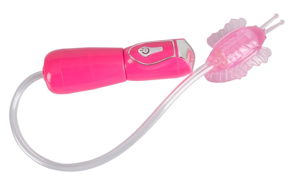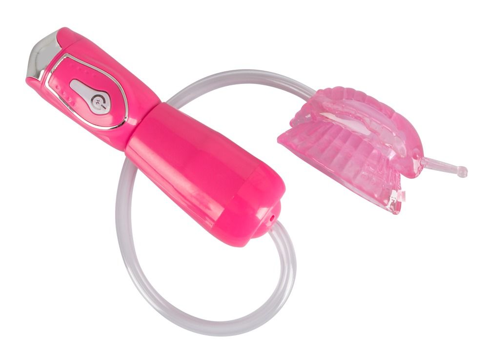 Розовая помпа-бабочка для клитора Permanent Kiss. 5 режимов всасывания. Размеры бабочки - 7,5 х 4 см. Длина шланга - 33 см.