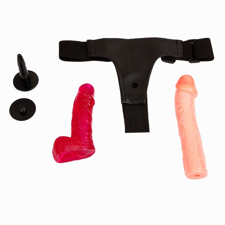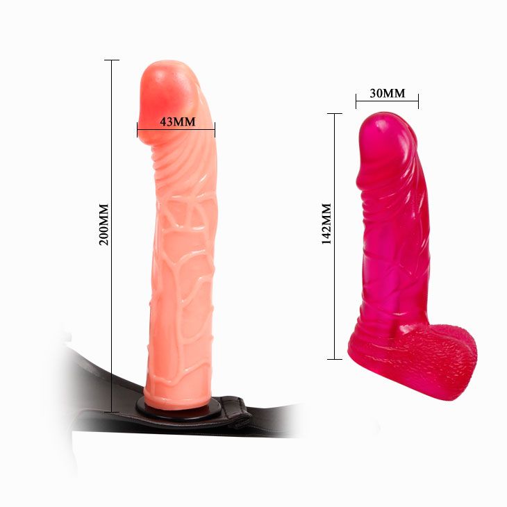 Женский страпон на ремешках с двумя насадками. Размер ремешков регулируется. Длина большого дилдо - 20 см., диаметр - 4,3 см. Длина маленького дилдо - 14,2 см., диаметр - 3 см.