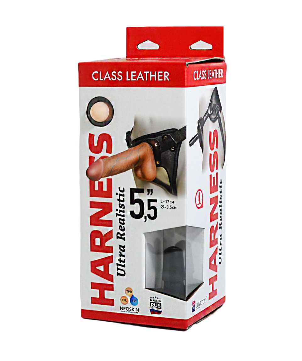 Комплект из трусиков с насадкой. Трусики изготовлены из кожи, комфортные и мягкие, удобно регулируются до необходимого размера. Насадка в виде члена с мошонкой, изготовленная из неоскин, имеет ярко выраженную головку и прорисованные вены. Рабочая длина - 14 см.