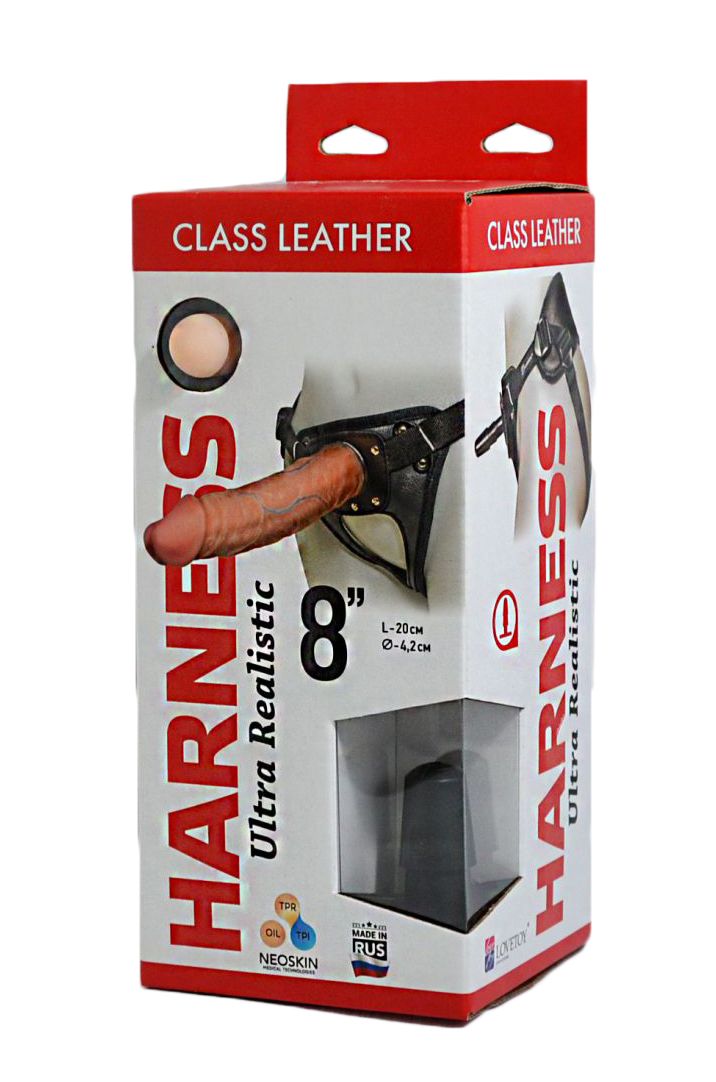 Комплект из трусиков с насадкой. Трусики изготовлены из кожи, комфортные и мягкие, удобно регулируются до необходимого размера. Насадка в виде члена без мошонки, изготовленная из неоскин, имеет ярко выраженную головку и прорисованные вены.