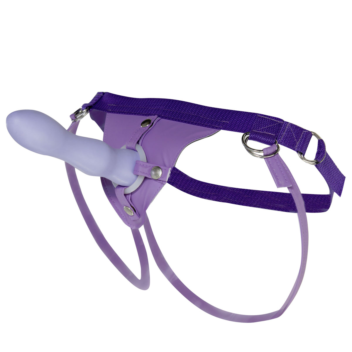 Трусики из кож. заменителя, покрытые сверху нейлоновой тканью на регулирующихся ремешках со страпоном в комплекте (нежно фиолетовые) . Сам имитатор создан из силикона, имеет рельефную поверхность для наиболее эффективной стимуляции. Насадка съёмная и поэтому может использоваться и без крепления. Само крепление системы Strap-On ( в виде кольца). В комплекте маска на глаза.