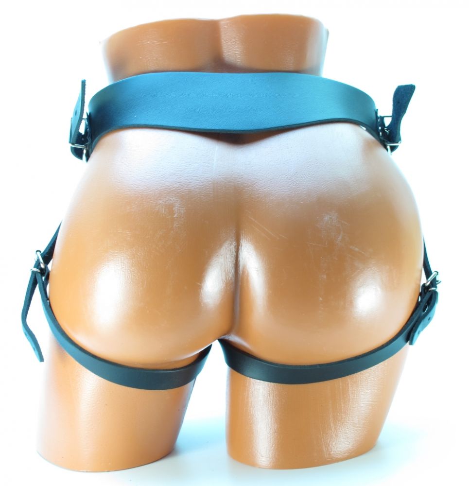 Трусики для страпона, изготовлены из кожи. Крепятся при помощи ремней (размер легко меняется). Диаметр отверстия регулируется под разные размеры насадок.