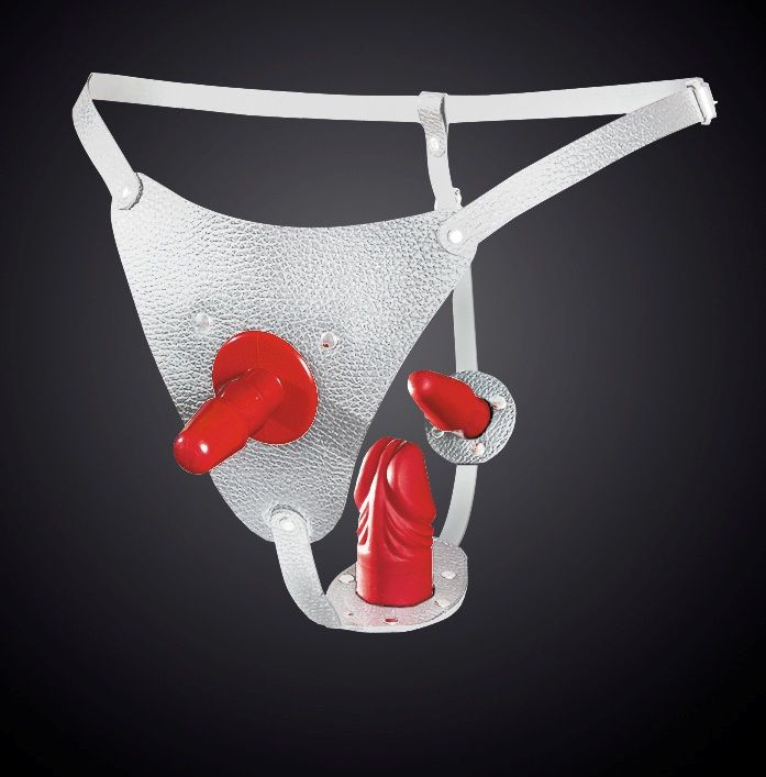 Изготовлены из натуральной кожи. При производстве используется никелированная фурнитура. Размер регулируется ремешками, которые крепятся на бёдрах (от 42 до 50 размера). В комплект входит съёмный пластиковый плаг для насадок, съёмный фаллоимитатор, а также съёмная анальная пробка. Подходит для использования как мужчиной, так и женщиной. Длина съемного фаллоимитатора - 8 см., диаметр - 3,5 см. Длина анальной пробки - 8,5 см., диаметр - 2,2 см.белый S-M-L